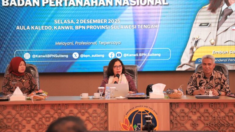 PALU, TAGAR-NEWS.com – Kementerian Agraria dan Tata Ruang/Badan Pertanahan Nasional (ATR/BPN) melalui Tim Pembina Wilayah 4 yang diketuai oleh Direktur Jenderal Penataan Agraria, Embun Sari, melaksanakan kegiatan pembinaan di lingkungan Kantor Wilayah Badan Pertanahan Nasional (Kanwil BPN) Provinsi Sulawesi Tengah, Selasa, 2 Desember 2025 kemarin.